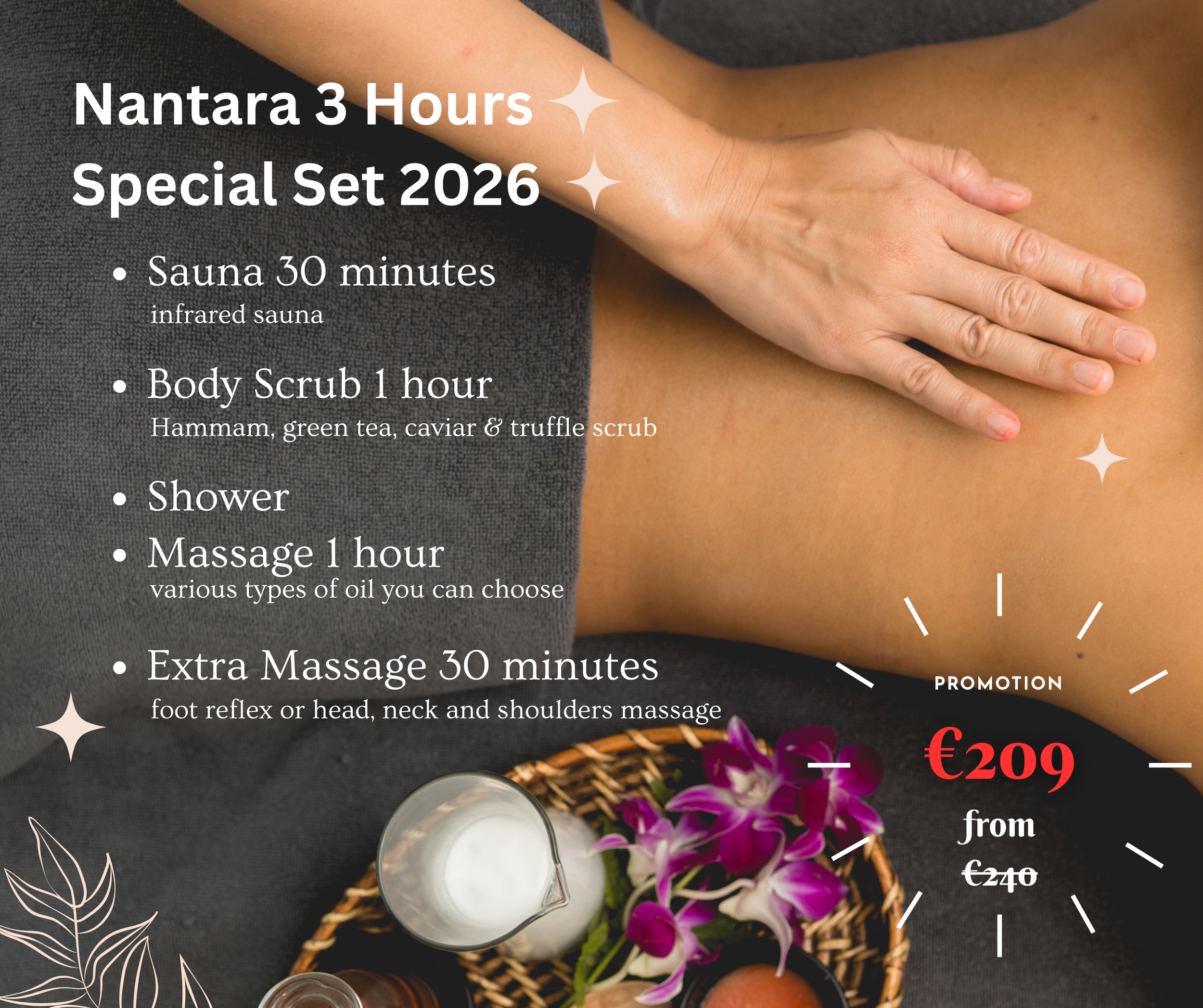 Enjoy our 3-hour package with a relaxing full-body massage and a refreshing body scrub. You can choose from 9 essential oils to suit your preference. The scrub removes dead skin and improves circulation, while the massage helps release tension and relax your muscles.